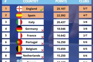 24/25赛季各联赛欧战积分(前2名获额外欧冠名额):