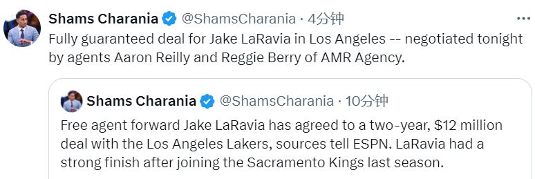 北京时间7月1日,据名记Shams报道,湖人敲定今夏首笔自由球员引援,2米03的神射手拉拉维亚以2年1200万美元的价格加盟球队,联手东契奇和詹姆斯。